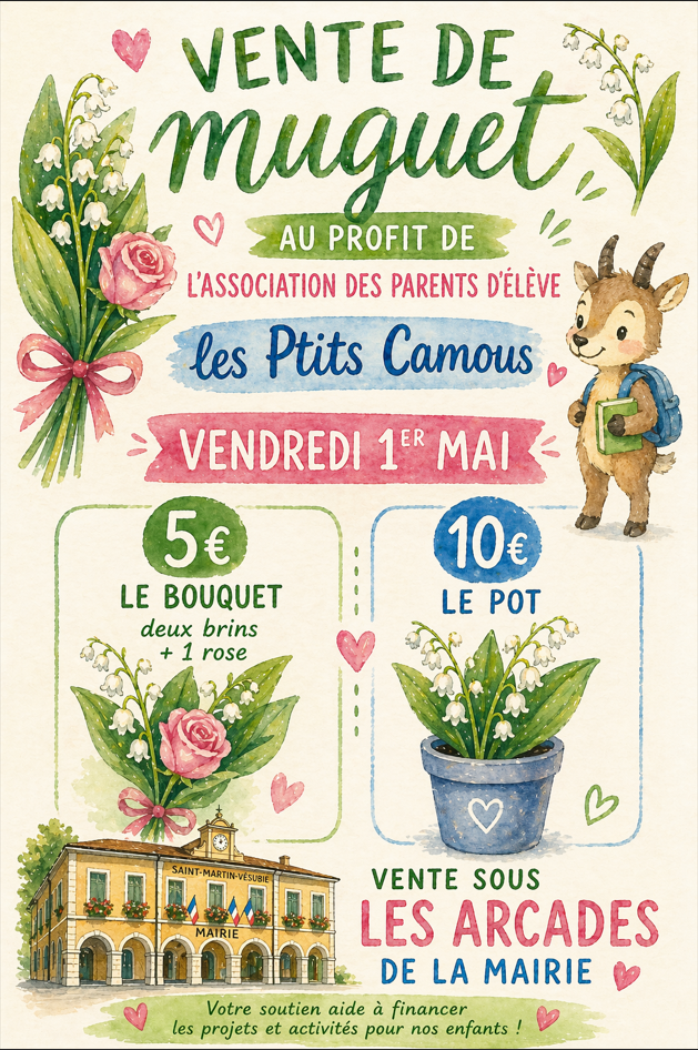 Venez acheter votre brin de muguet vendredi 1er mai, sous les arcades de la mairie, au profit de l’association des parents d’élève.